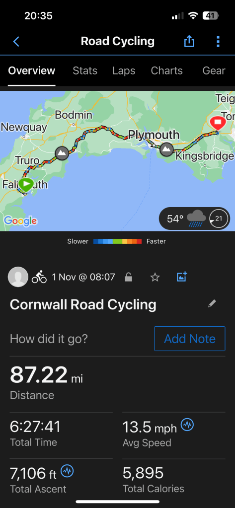 As I promised some final stats, 3751 miles in 289 hours at 12.98 miles per hour. Total climbing 173,000 ft or just about 6 times Everest! According to Garmin I used 217,000 calories. Maximum speed was 48.9mph on the A35 in Dorset. The main stat is of course raising over £10,000 for Mind. The need is immense but this is a significant contribution.